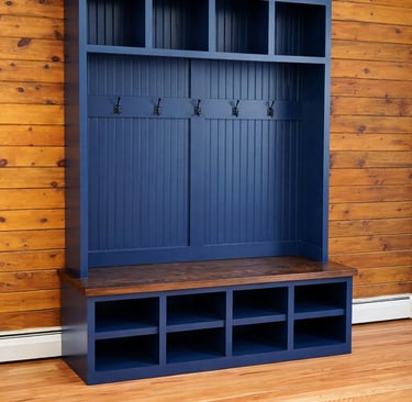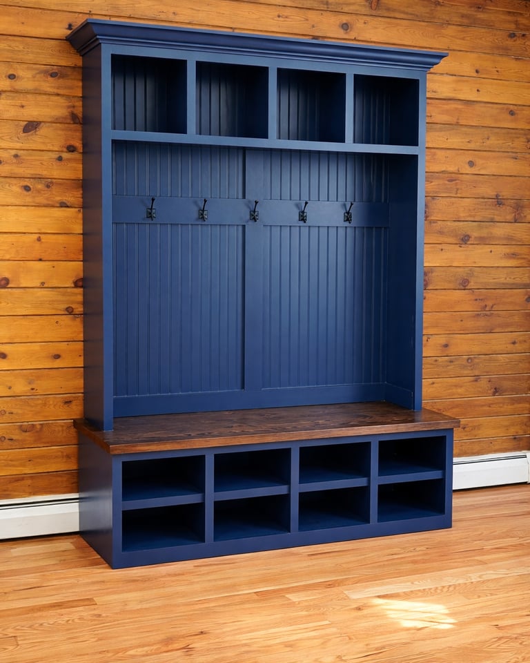 Each Fort Worth Hall Tree is custom made to order, with numerous size and color combinations available to fit your space and style perfectly. The piece shown is a 4-cubby unit in Naval Blue, complete with removable cubby shelving for maximum flexibility.