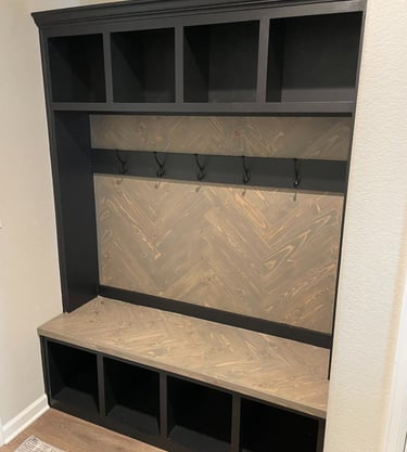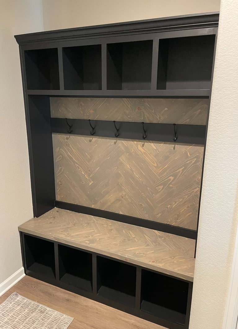 Are you tired of tripping on those shoes when you walk in the laundry room? Get your handcrafted built-in storage bench, coat hanger, backpack hanger, and more.